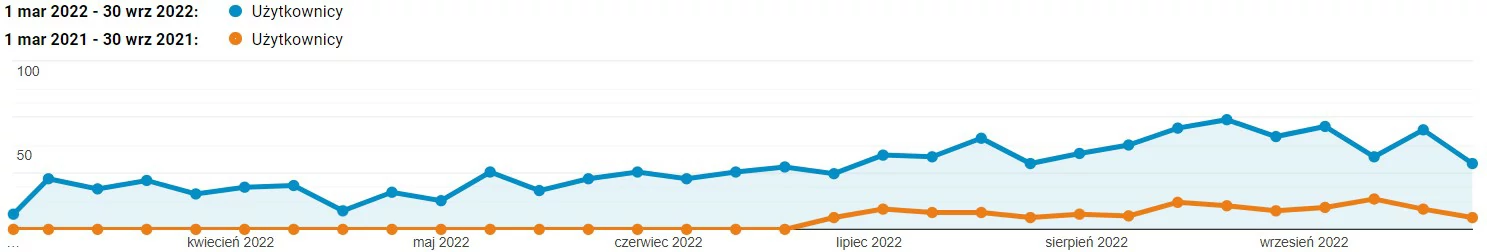 Niestety ciężko porównać ruch rok do roku dla dłuższego przedziału czasu, ponieważ strona funkcjonuje od marca 2021, a nasza współpraca nie objęła nawet pełnego roku. Cel jednak został zrealizowany i to na dość wczesnym etapie. Poniżej znajdziecie Państwo porównanie rok do roku okresu marzec-wrzesień. Są to odpowiednio miesiące sezonu średniego, wysokiego i średniego.