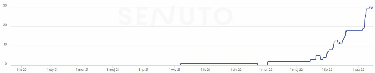 • widoczność top10 wzrosła z 1 słowa kluczowego do 30, co daje wzrost widoczności top10 o 3000% w ciągu 10 miesięcy